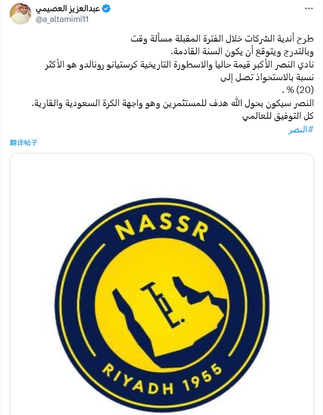 利雅得勝利目前是最有價值的俱樂部,羅納爾多目前的股權比率最高,達到20。利雅得勝利將成為投資者的焦點,并成為沙特和亞洲足球的外墻。